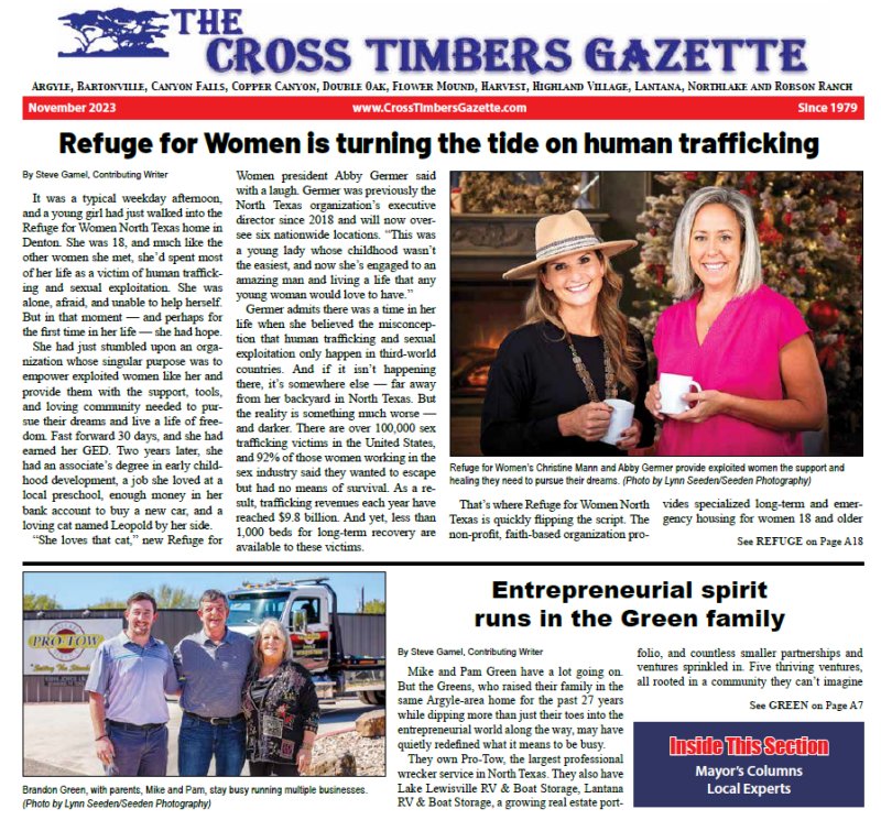 HomeThe Cross Timbers Gazette Latest Issues The Cross Timbers Gazette Latest Issues The Cross Timbers Gazette November 2023 By Max Miller November 3, 2023 0 1431 FacebookTwitterPinterestLinkedinWhatsAppReddItEmailPrint View the Cross Timbers Gazette full-screen. Share FacebookTwitterPinterestLinkedinWhatsAppReddItEmailPrint Previous articleFoodie Friday: Thanksgiving feast without the fussNext articleFlower Mound firefighters extinguish house fire Max MillerMax Miller is the publisher of The Cross Timbers Gazette. Related Articles Southern Denton County Business Circle R Ranch seeks buyer to carry on its legacy Southern Denton County Local News Flower Mound police warn parents about risky “Senior Assassin” game among teens Southern Denton County Business Kimzey’s Coffee Shop in Argyle to close after 8 years of serving community Popular This Week Southern Denton County Business Circle R Ranch seeks buyer to carry on its legacy Southern Denton County Local News Flower Mound police warn parents about risky “Senior Assassin” game among teens Southern Denton County Business Kimzey’s Coffee Shop in Argyle to close after 8 years of serving community Southern Denton County Business Delhi6 Indian Kitchen expanding to larger location in Highland Village Southern Denton County Life Celebration planned for Denton stay-at-home mom and American Idol finalist