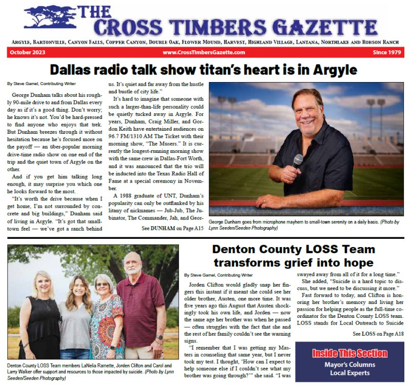 HomeThe Cross Timbers Gazette Latest Issues The Cross Timbers Gazette Latest Issues The Cross Timbers Gazette October 2023 By Max Miller October 5, 2023 0 1197 FacebookTwitterPinterestLinkedinWhatsAppReddItEmailPrint View the Cross Timbers Gazette full-screen. Share FacebookTwitterPinterestLinkedinWhatsAppReddItEmailPrint Previous articleNew space-themed playground opens in Flower MoundNext articleFrom Bartonville to the Big Screen: Allie Melson sets her sights on stardom Max MillerMax Miller is the publisher of The Cross Timbers Gazette. Related Articles Southern Denton County Business Circle R Ranch seeks buyer to carry on its legacy Southern Denton County Local News Flower Mound police warn parents about risky “Senior Assassin” game among teens Southern Denton County Business Kimzey’s Coffee Shop in Argyle to close after 8 years of serving community Popular This Week Southern Denton County Business Circle R Ranch seeks buyer to carry on its legacy Southern Denton County Local News Flower Mound police warn parents about risky “Senior Assassin” game among teens Southern Denton County Business Kimzey’s Coffee Shop in Argyle to close after 8 years of serving community Southern Denton County Business Delhi6 Indian Kitchen expanding to larger location in Highland Village Southern Denton County Life Celebration planned for Denton stay-at-home mom and American Idol finalist